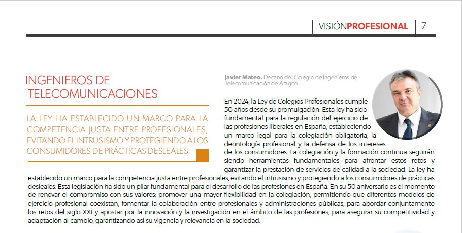 La revista de COPA (Colegios Profesionales de Aragón) ha querido hacer una reflexión en torno a los 50 años de la Ley de los Colegios Profesionales (1974-2024). Por parte del Colegio de Ingenieros de Telecomunicación de Aragón, nuestro Decano, Javier Mateo, hacía una reflexión que os compartimos: